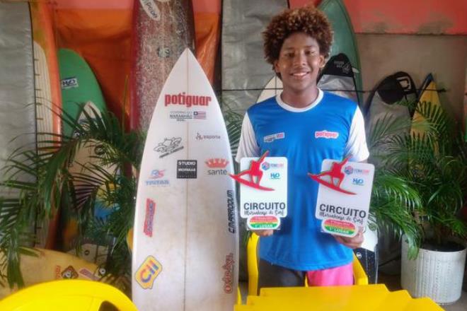 O surfista maranhense Kadu Pakinha, de 14 anos, fez história na disputa da terceira etapa do Circuito Maranhense de Surf, competição organizada pela Federação Maranhense de Surf (Femasurf) e realizada entre sexta-feira (7) e domingo (9), na Praia da Ponta d'Areia, em São Luís. Com muito talento e desenvoltura, o jovem atleta faturou os títulos das categorias Sub-16 e Open do torneio estadual.