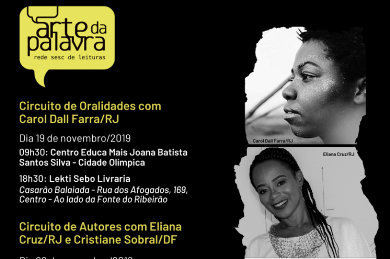 Como um dos três eixos do Projeto Arte da Palavra – Rede Sesc de Leituras, o Circuito de Autores 2019 promove bate-papos com escritores de diversos estilos literários. Nesta edição, que acontece nos dias 19 e 22 de novembro, o Sesc traz para São Luís duas consagradas autoras brasileiras: Cristiane Sobral e Eliana Alves Cruz, além da poesia da carioca Carol Dall Farra. O Circuito é aberto à comunidade.