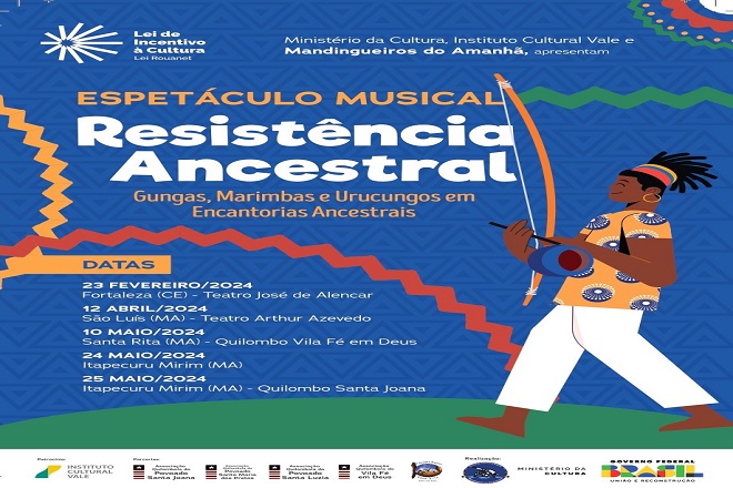 O Centro Cultural Mandingueiros do Amanhã traz ao Maranhão e Ceará o Projeto “Resistência Ancestral: fortalecendo raízes, cultivando sonhos”, com a realização do espetáculo “Resistência Ancestral: Gungas, Marimbas e Urucungos em encantorias ancestrais”. O musical mostra a conexão da Capoeira Angola com o terreiro, o quilombo e sua raiz negra. Para além do esporte e da luta, os artistas levam ao palco a ancestralidade da Capoeira Angola, com seus ritos, musicalidade, mistérios e seu sagrado.