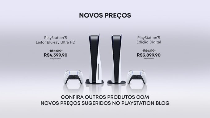 A Sony anunciou nesta quarta-feira (18) o reajuste nos preços do PlayStation 5 no Brasil. O modelo com leitor de Blu-Ray passa a custar R$ 4.399,90 enquanto o PS5 Edição Digital, sem leitor de discos, foi reduzido para R$ 3.899,90.