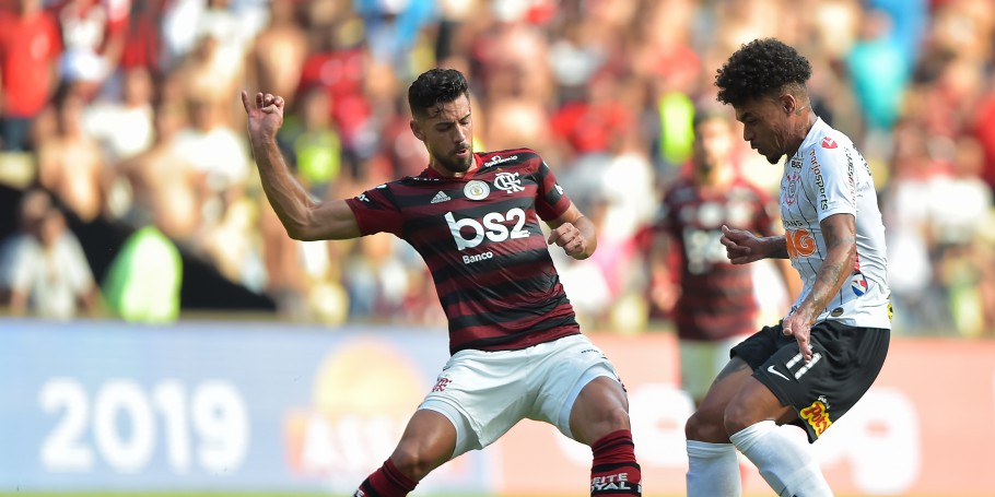 Flamengo e Corinthians fizeram um primeiro tempo equilibrado até os 40 minutos do primeiro tempo. O Timão começou melhor, criando algumas chances e marcando bem a equipe da casa, que teve mais posse de bola e apostava em jogadas pelo alto. Foi em um lance desses que saiu o pênalti que abriu o placar para o Rubro-Negro. Aos 42 minutos, após Everton Ribeiro cruzar para Arrascaeta, o uruguaio caiu em dividida com Cássio. Na cobrança, aos 45, Bruno Henrique bateu cruzado e viu o goleiro corintiano fazer a defesa, mas, no rebote, o camisa 27 não desperdiçou: 1 a 0. No minuto seguinte, Gerson avançou pelo meio, se livrou da marcação e tocou na frente para Bruno Henrique dar um toque sutil e ampliar a vantagem rubro-negra.