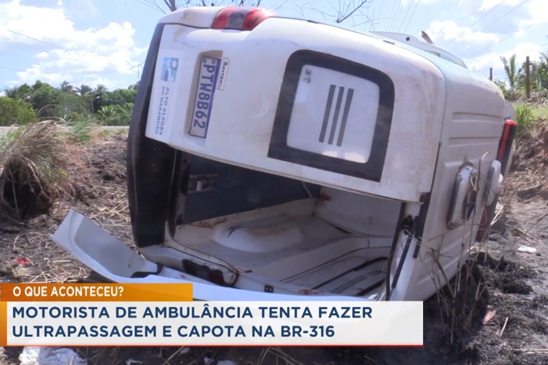 Uma ambulância da cidade de Alto Alegre do Maranhão capotou na BR-316, em Bacabal. Segundo as testemunhas, o motorista tentou ultrapassar um caminhão e perdeu o controle do veículo quando viu outra carreta indo em direção à ambulância.