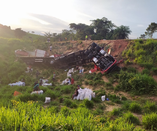 A carreta bitrem transportava farelo de milho, quando na saída de um aclive e de uma curva, perdeu o controle e capotou. A combinação de veículos parou em "L", fazendo uma alavanca piramidal, conforme imagens divulgadas pela PRF.