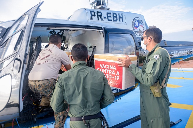 Para a distribuição estão sendo utilizados três aviões, três helicópteros e 30 automóveis. Uma das primeiras cidades a receber a vacina por helicóptero foi Primeira Cruz, por volta das 8h.