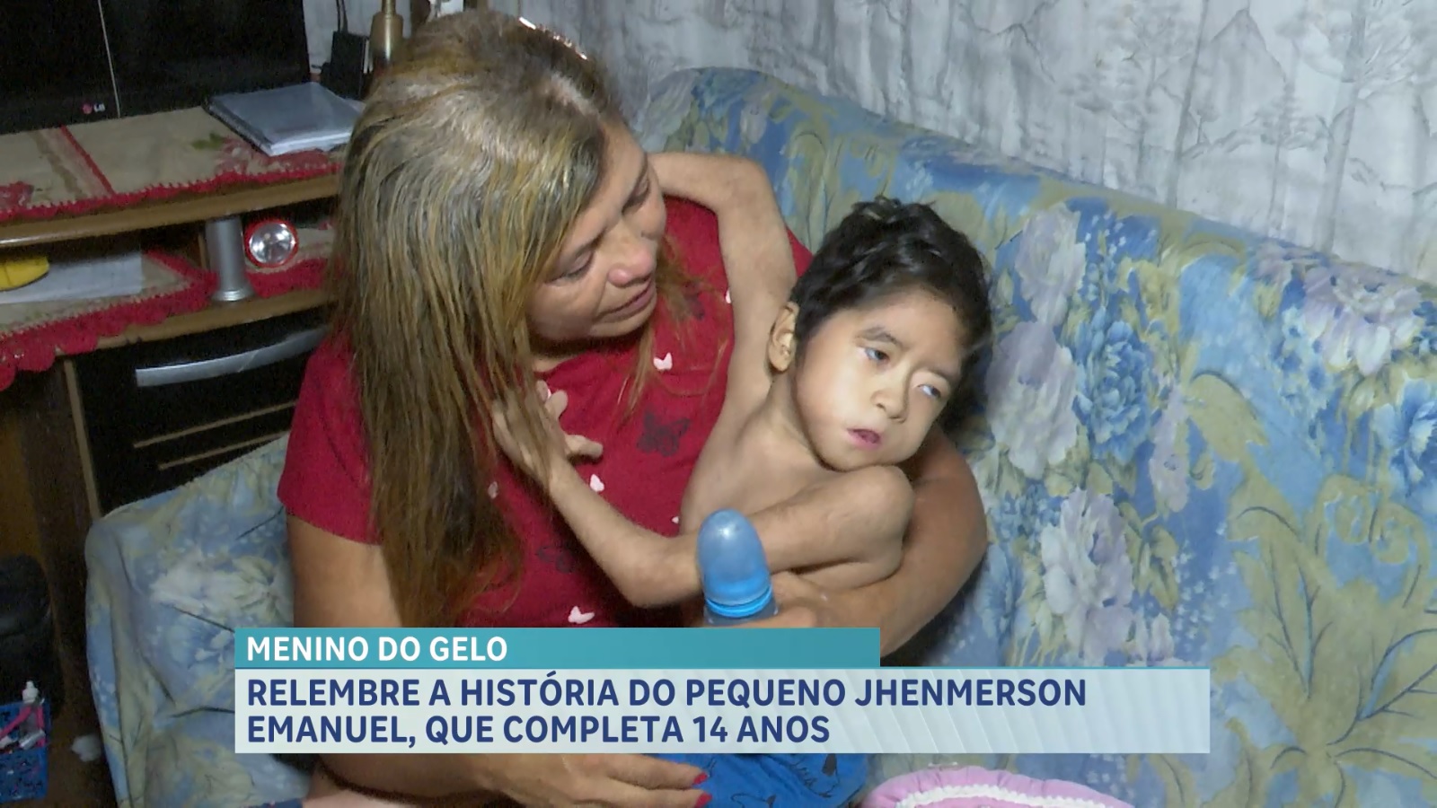 Por conta da doença, ele não se desenvolveu como as outras crianças de mesma idade. Desde que nasceu, Jhenmerson recebe os cuidados da avó, Josinete Coutinho. Ela disse que o ambiente frio é o único método de deixar a criança em casa sem maiores complicações.
