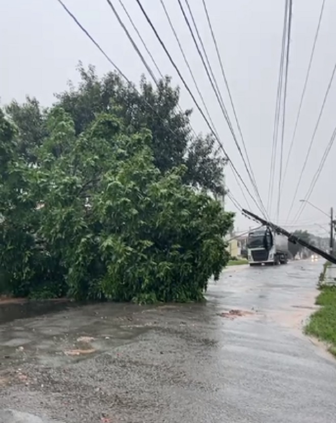 Na região do bairro do Vinhais, a intensidade da chuva derrubou uma árvore que acabou também derrubando um poste.