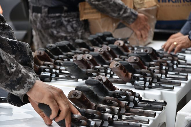 No total, foram encontradas 132 armas de fogo calibre 38, quatro escopetas calibre 12, três pistolas 380, 2.093 munições e 222 pares de coletes balísticos.