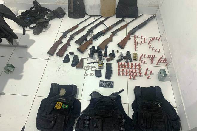 Uma operação da Secretaria de Estado da Segurança Pública, executada pela Polícia Civil do Maranhão na manhã desta quinta-feira (7) em uma fazenda localizada na comunidade Campina, entre os municípios de Boa Vista do Gurupi e Junco do Maranhão, levou à prisão de quatro indivíduos. Além das prisões, os policiais localizaram e apreenderam um arsenal com nove armas de fogo longas e curtas, coletes balísticos, entre outros itens.