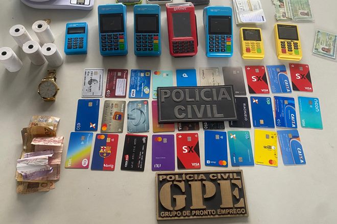 Durante a ação da Polícia, além de cumprirem aos mandos judiciais, nos endereço dos investigados, as equipes conseguiram apreender diversos cartões de banco, dinheiro em espécie, carteira de identificação, aparelhos celulares, máquinas de cartões e um veículo que era utilizado na práticas criminosa.