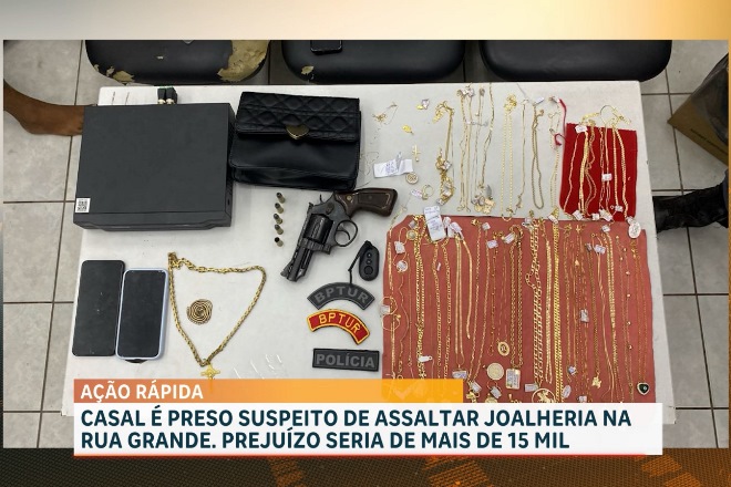 Segundo informações da polícia, os suspeitos chegaram a joalheria de mãos dadas como um casal e anunciaram o assalto. Ambos estavam com armas de fogo e chegaram a agredir funcionárias da loja. Na delegacia, todo o material apreendido: uma arma de fogo, quatro munições intactas e uma deflagrada, além disso, o material roubado na joalheria também foi encontrado com o casal como 48 correntes e 33 pingentes, dois aparelhos celulares, uma bolsa de mão, um aparelho de armazenamento de câmera de videomonitoramento, um controle de alarme, além de duas correntes douradas que seriam dos suspeitos.