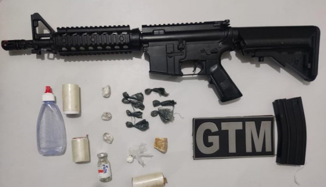 Na residência do suspeito, os policiais apreenderam 07 papelotes semelhante à cocaína, 01 porção maior semelhante ao crack e 01 porção semelhante à cocaína, além de T4 tipo Airsoft.