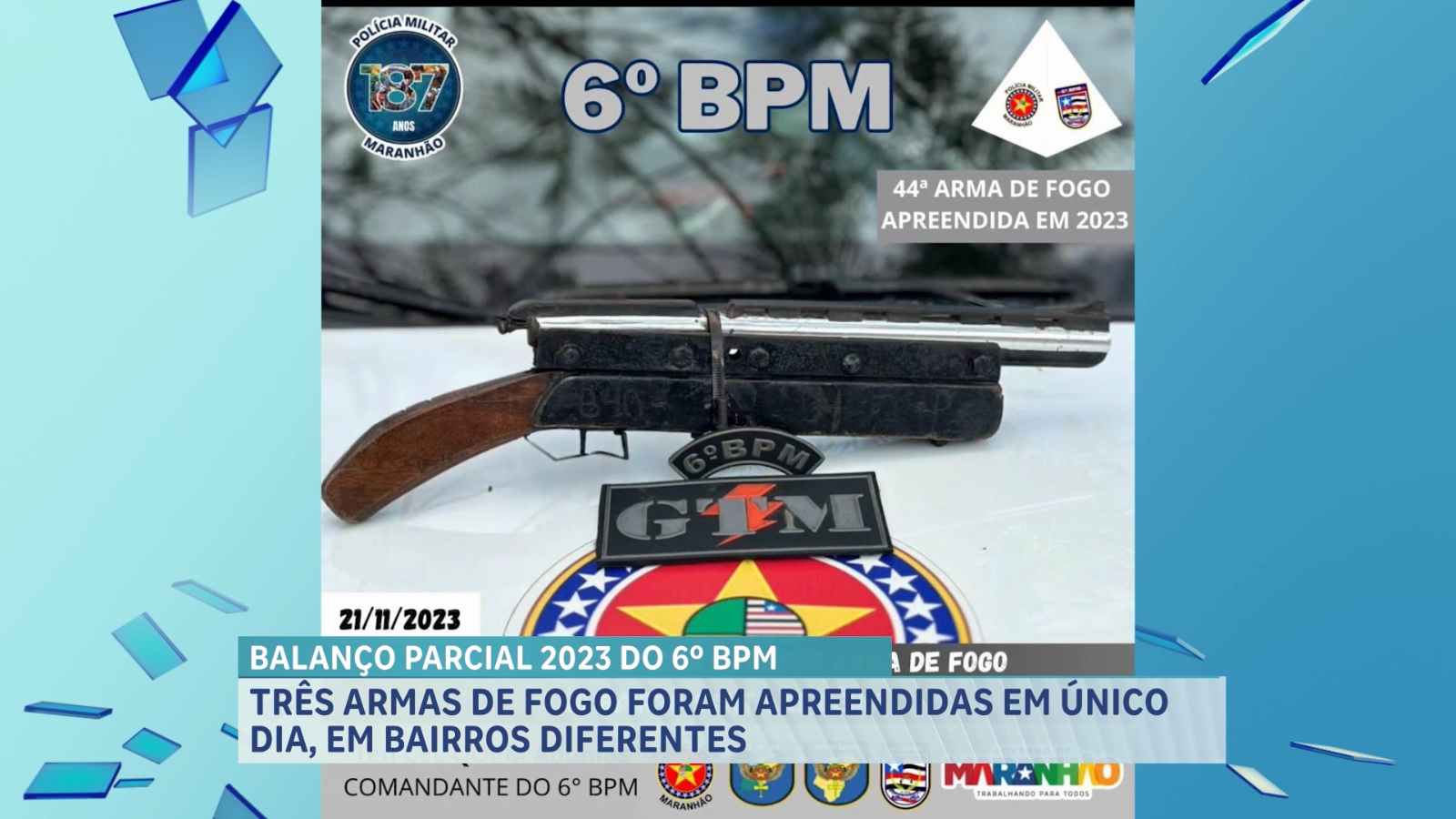 Em um único dia o 6° Batalhão de Polícia Militar (6º BPM) conseguiu apreender três armas de fogo em São Luís. Duas delas eram de fabricação caseira. Somente em 2023, 45 armas foram apreendidas pelo 6º BPM.