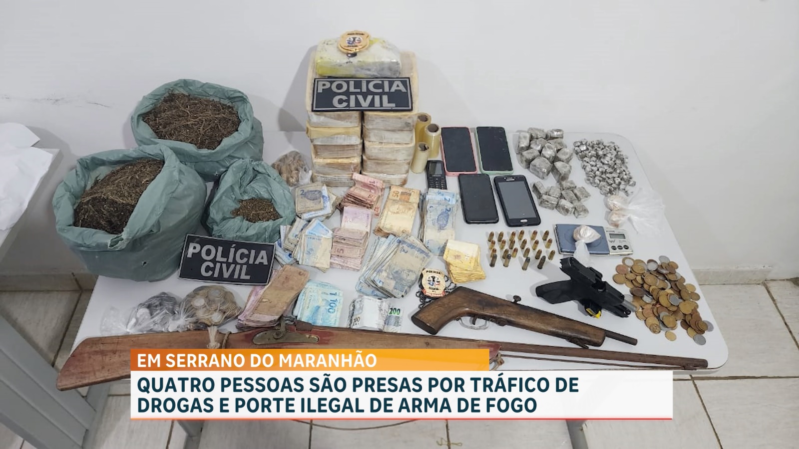 Na manhã desta terça-feira (23), uma força-tarefa da Polícia Civil do Maranhão (PCMA), foi realizada na cidade de Serrano do Maranhão, a cerca de 187 km de São Luís, a fim de cumprir mandados de prisão e de busca domiciliar contra alvos investigados pelos crimes de tráfico de drogas e associação criminosa. Como resultado do trabalho policial, quatro homens foram presos em flagrante pelos crimes de tráfico de drogas, porte de ilegal de arma de fogo e associação criminosa.