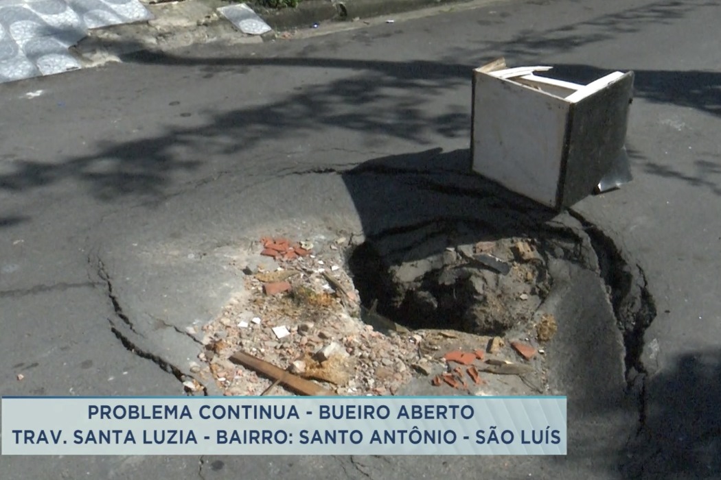 Um esgoto estourado no meio da travessa Santa Luzia, bairro Santo Antônio, tem dificultado a passagem de veículos e pedestres. Moradores colocaram uma caixa para sinalizar, assim, evitando que os veículos caiam no buraco que se formou.