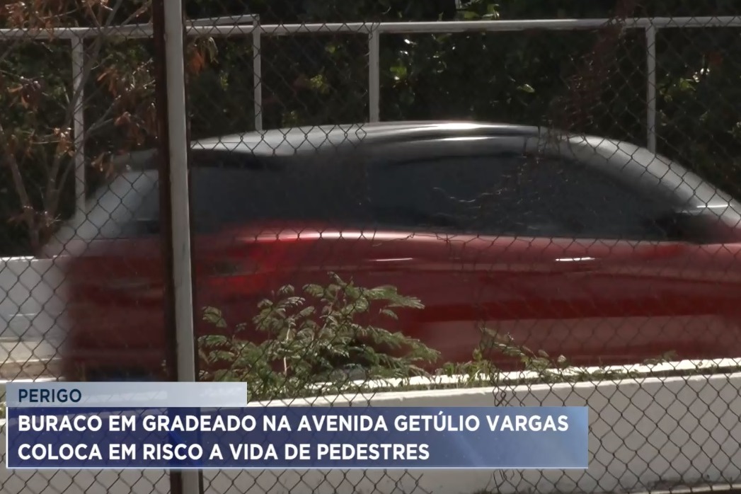 Pedestres que circulam pela Avenida Getúlio Vargas, no bairro Monte Castelo, denunciam a situação de uma grade de proteção que está danificada e apresenta perigo para quem trafega pelo local.
