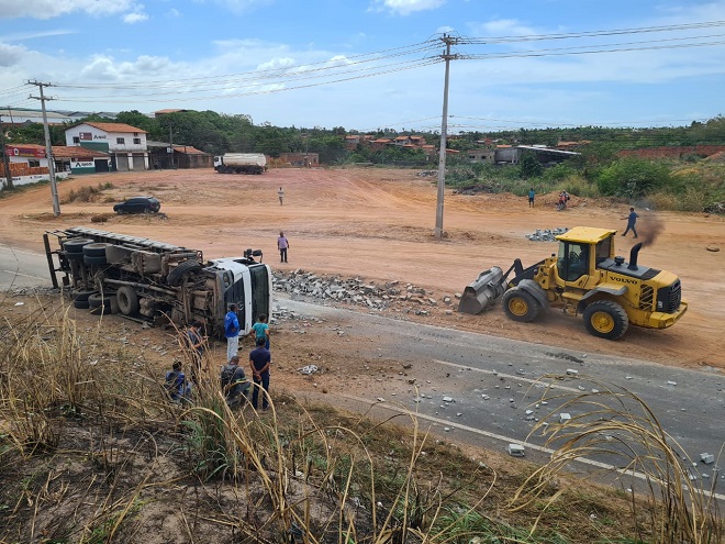 Uma carreta colidiu com um poste e acabou tombando no início da tarde desta quarta-feira (10), no km 03 da BR-135, no Funil, em São Luís.