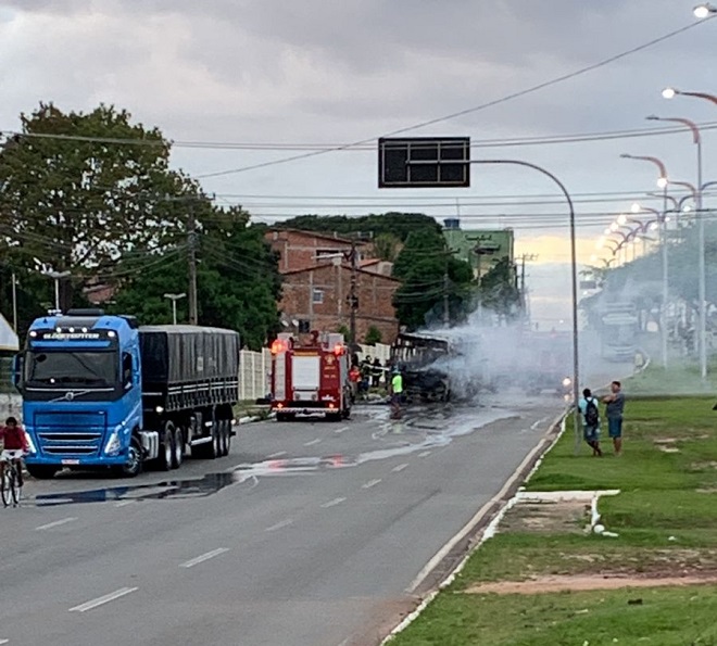 Um ônibus pegou fogo na manhã desta quinta-feira (4), na Avenida dos Franceses, na região do bairro Anil, em São Luís.