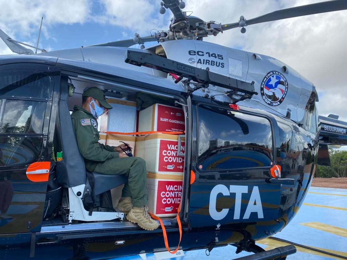 Desde o início da campanha de vacinação contra a Covid-19 no Maranhão, as ações de distribuição das doses contam com a parceria da Secretaria de Segurança Pública, através da Polícia Militar, em conjunto com o Corpo de Bombeiros, Polícia Civil e o Centro Tático Aéreo (CTA). De acordo com o comandante Alcimário Costa, quatro helicópteros do CTA estão sendo utilizados na missão de distribuição de vacinas.