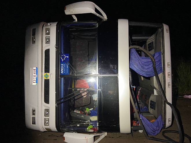 Segundo informações da Polícia Rodoviária Federal, o ônibus não conseguiu subir um aclive e acabou tombando na rodovia. O acidente deixou quatro pessoas feridas. Não foi registrada nenhuma morta.