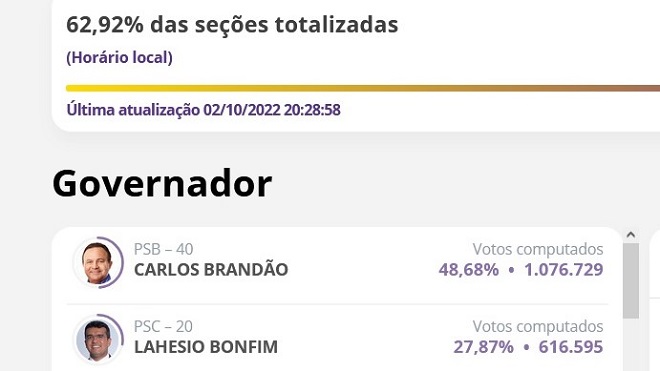 Lahesio Bonfim (PSC) está em segundo lugar, com 27,87% (584.319 votos).