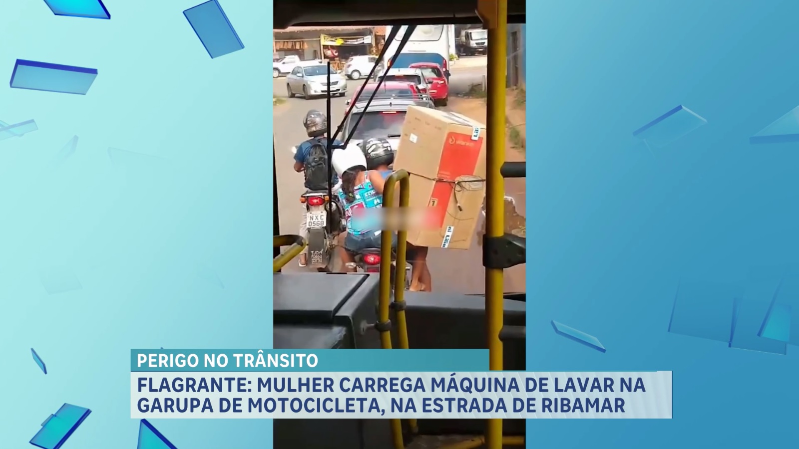 Mas a atitude é um alerta para os riscos de acidentes, devido ao fato da mulher carregar a carga somente em uma das pernas e o eletrodoméstico tira a visibilidade de um dos retrovisores.