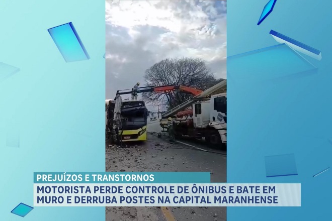 Um ônibus do transporte coletivo bateu em um muro e mais três postes de iluminação pública, na madrugada desta terça-feira (9), na Rua Deputado Luís Rocha, no bairro Vicente Fialho, em São Luís.