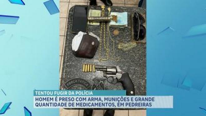 Um homem foi conduzido por policiais militares por porte de arma e transporte de medicamentos, na cidade de Pedreiras. Segundo a polícia o homem conduzia um veículos sob efeito de álcool e ultrapassou uma viatura da PM em alta velocidade.